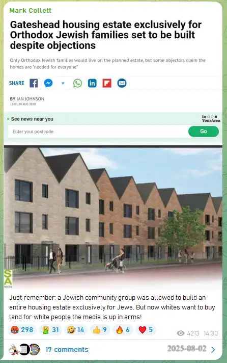 Just remember: a Jewish community group was allowed to build an entire housing estate exclusively for Jews. But now whites want to buy land for white people the media is up in arms!