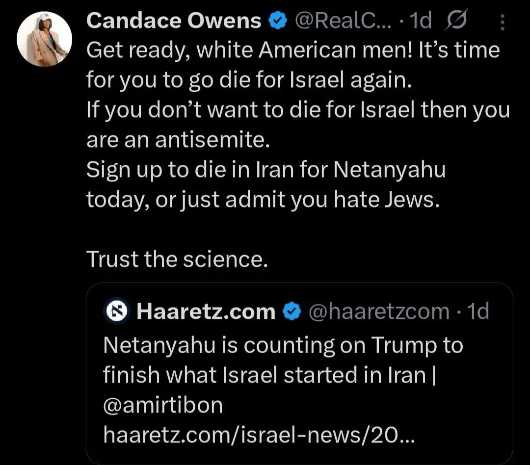 Get ready, white American men! It’s time for you to go die for Israel again. If you don’t want to die for Israel then you are an antisemite. Sign up to die in Iran for Netanyahu today, or just admit you hate Jews.